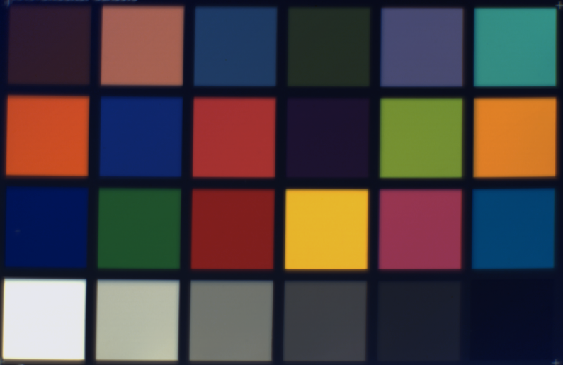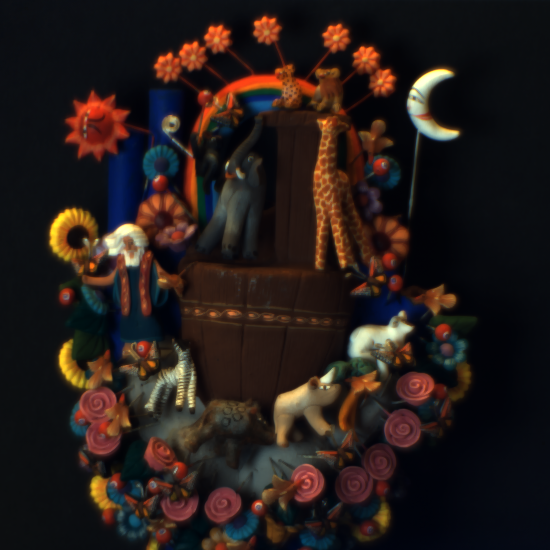 Drag the slider to move the second lens. Different wavelengths come into focus on the grayscale sensor, creating wavelength-dependent blur that serves as our optical encoding.